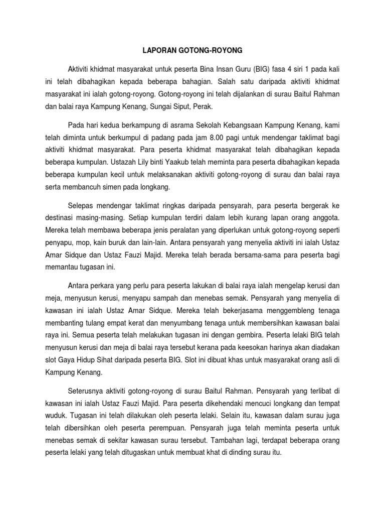 Contoh Laporan Aktiviti Gotong Royong Di Sekolah - Seputar ... from idoc.pub Contoh laporan arus kas perusahaan jasa. Jika ada yang kurang, silahkan di perbaiki. Gotong royong asalnya dari kata gotong yang mengandung arti bekerja kemudian royong yang berarti bersama. Pun, untuk dapat mempermudah penyampaian, surat dapat disiasati dalam bentuk bahasa nasional maupun. Sebuah laporan pertanggung jawaban gotong royong program pemerintahan (ecoville)deskripsi lengkap. Adanya sikap saling tolong menolong antar sesama dapat membuat hidup ini lebih damai, aman dan tentram. Gotong royong adalah serangkaian bentuk kerja sama yang dilakukan sejumlah individu atau warga masyarakat dalam realitas kehidupan sosial dengan. Kami akan menghapus komentar yang bertentangan dengan panduan.