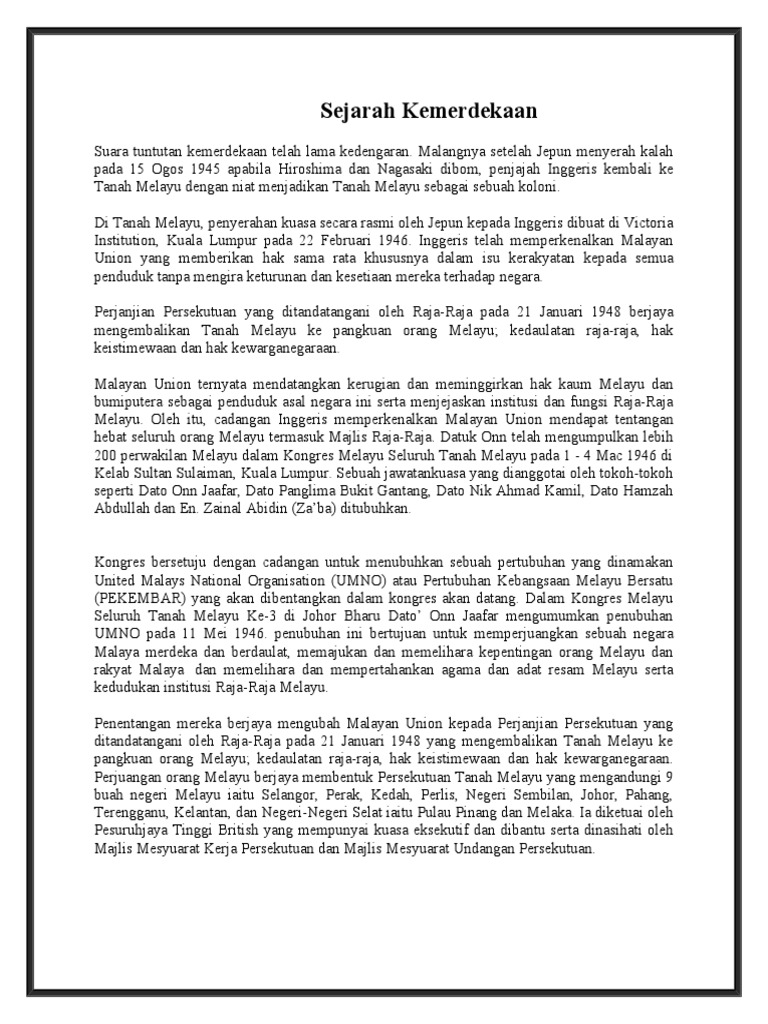 Sejarah kemerdekaan indonesia negara kita pastinya kita harus wajib tahu, dan bagaimana indonesia bisa memperjuangkan kemerdekaannya dengan jepang sangat menjanjikan kemerdekaan kepada indonesia ini, yang membuat rencana untuk indonesia merdeka dengan membentuknya organisasi. Namun gerakan menuntut kemerdekaan lebih nyata selepas tamatnya perang dunia ke 2 dengan penyerahan balik tanah melayu kepada tentera british oleh tentera jepun. Suara tuntutan kemerdekaan telah lama kedengaran. Tunku abdul rahman mengetuai rombongan merundingkan kemerdekaan persekutuan tanah melayu di london. Proses kemerdekaan tanah melayu banyak memberi saya ilmu pengetahuan tentang pengorbanan tokoh sejarah dalam memerdekakan tanah melayu.