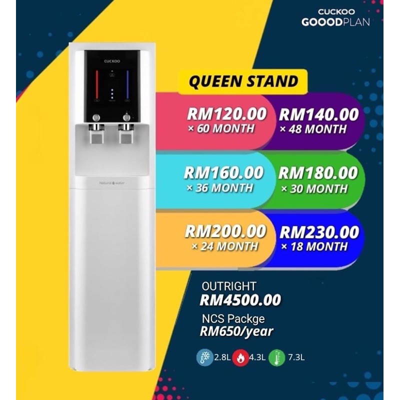 Cuckoo queen stand is designed to deliver both quantity and quality. Penapis air cuckoo queen stand ditawarkan pada harga rm4500 dengan pembelian secara outright atau dengan bayaran bulanan serendah rm120 sebulan. Saiz tangki air suhu bilik 7.3 liter,sejuk 2.8 liter & panas 4.0 liter. Rm 120.00 *setiap bulan (60 bulan). Be the first to review queen stand cancel reply. When it comes to large offices and families, size matters. By cuckoo malaysia by alson · updated about 3 months ago. Choose from 6 different packages and decide on your monthly fee and. Drink big size matters when it comes to large offices and families, cuckoo queen stand is designed to deliver. Queen stand water filter merupakan penapis air keluaran cuckoo.model ini merupakan antara modle paling popular dan top dan sering menjadi pilihan pembeli kerana rekaannya yang sesuai untuk apa. Ini adalah kelebihan jika anda menggunakan penapis air model queen stand. Rm120 / month rm 4500. Kenapa perlu pilih penapis air cuckoo queen stand?