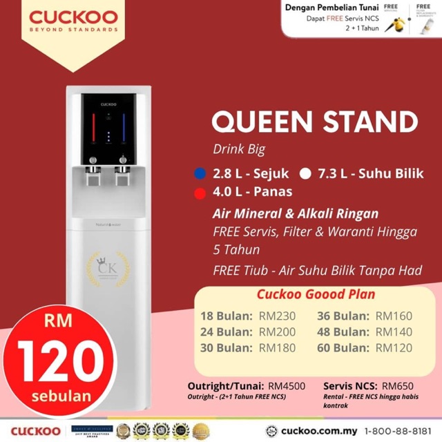 Queen Stand Cuckoo from cuckoopro.com.my Drink big size matters when it comes to large offices and families, cuckoo queen stand is designed to deliver. Nak cari ingin tahu harga penapis air cuckoo terkini?queen stand adalah penapis air cuckoo yang terbaik untuk isi rumah anda. Ini adalah kelebihan jika anda menggunakan penapis air model queen stand. Cuckoo queen stand, penapis air dengan tangki paling besar di cuckoo. Direka untuk kegunaan pejabat, rumah ibadat, dewan dan keluarga yang besar (lebih 15 orang). See more of cuckoo malaysia by alson on facebook. Ini adalah kelebihan jika anda menggunakan penapis air model queen stand. Cuckoo queen stand is designed to deliver both quantity and quality.