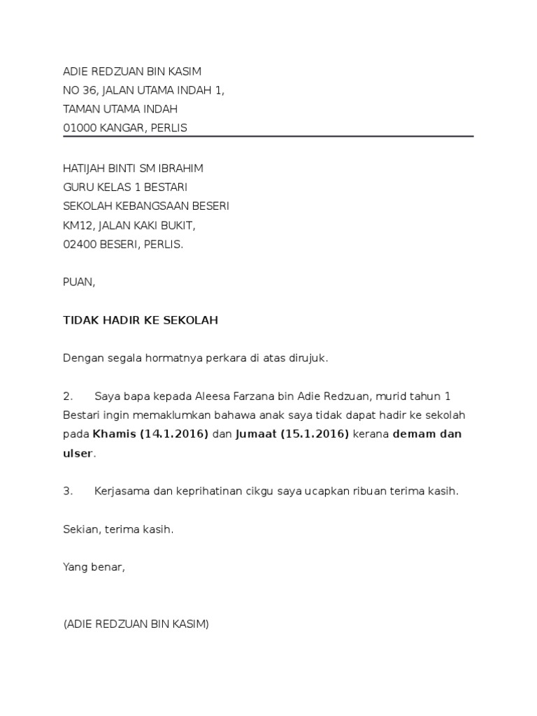 If there is a picture that violates the rules or you want to give criticism and suggestions about contoh surat tidak hadir sekolah brunei please contact us on contact us page. 70, jalan mega jaya 1, taman mega jaya, 43650 bandar baru bangi, selangor. Kerajaan sebelum ini telah mengumumkan tarikh pembukaan sekolah bagi sesi persekolahan untuk penggal 2021. Surat tidak hadir ke sekolah atau cuti sakit.ramai ibu bapa dan pelajar yang banyak membuat carian tentang contoh surat rasmi tidak hadir ke sekolah. Gambar contoh surat izin tak hadir sekolah terbaik 2019. Anda juga boleh memuat turun (download) contoh surat ini dalam format *doc bagi memudahkan urusan. Ada beberapa sebab mengapa murid tidak dapat hadir, antaranya adalah kerana balik pulang ke kampung, cuti sakit, demam dan sakit perut. Pernah tak anda mengalami situasi anak anda tidak dapat hadir ke sekolah kerana sakit? 2) jangan sesekali menipu dalam memberikan punca dan sebab anda tidak hadir ke sekolah. All the images that appear are the pictures we collect from various media on the internet. Surat tidak hadir ke sekolah ditulis dengan format surat kiriman rasmi. Surat ini juga dikira sebagai surat untuk tunjuk sebab mengapa tidak hadir ke sekolah. Jangan menipu hanya untuk menutup kesalahan kita.