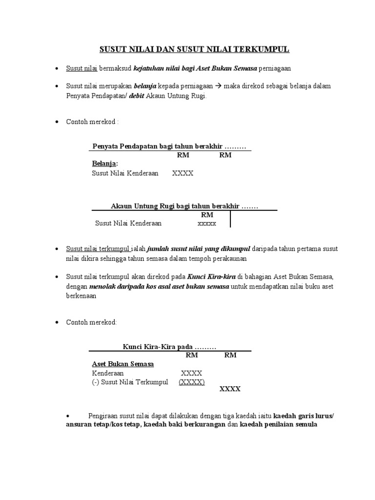 Susut Nilai Dan Susut Nilai Terkumpul from imgv2-2-f.scribdassets.com Fungsi ddb mengira susut nilai aset dalam tempoh yang ditetapkan dengan menggunakan kaedah penurunan aritmetik. Rumah menjadi eset berganda dari kenderaan yg susut nilai. House becomes double essence from vehicles that decrease value. The decline in value of assets. Potongan cukai diberikan dalam bentuk elaun modal sebagai ganti kepada perbelanjaan susut nilai bagi pembelian asetyang digunakan di dalam perniagaan, dalam menentukan pendapatan statutori bagi suatu punca perniagaan. Another word for opposite of meaning of rhymes with sentences with find word forms translate from english translate to english words with friends scrabble crossword / codeword words starting with words ending. Susut nilai kaedah garis lurus / ansuran tetap (a.k.a. 17 accummulated depreciation susut nilai terkumpul 18 acquired assets aset yang diperoleh 19 acquisition perolehan 20 acquisiton cost kos perolehan 21 acquisition date tarikh perolehan